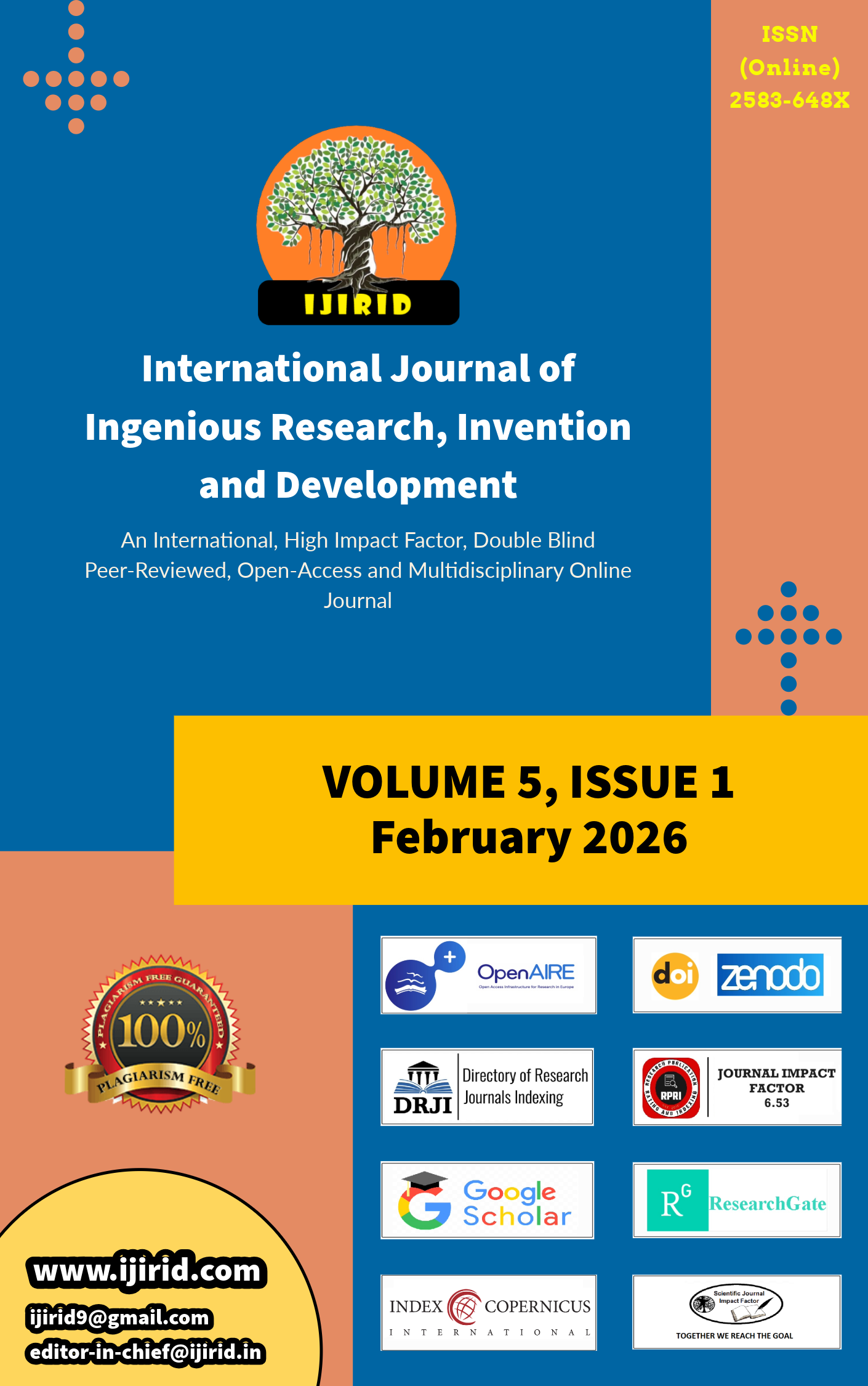 The International Journal of Ingenious Research, Invention and Development (IJIRID) is a International, High Impact Factor, Open Access, Bi-Monthly, Peer-Reviewed Journal. The journal aims at promoting innovative research in various disciplines of Science, Engineering and Technology. IJIRID inviting authors to submit original and unpublished work in terms of written reviews, short communications and notes dealing with numerous disciplines that communicates current research.